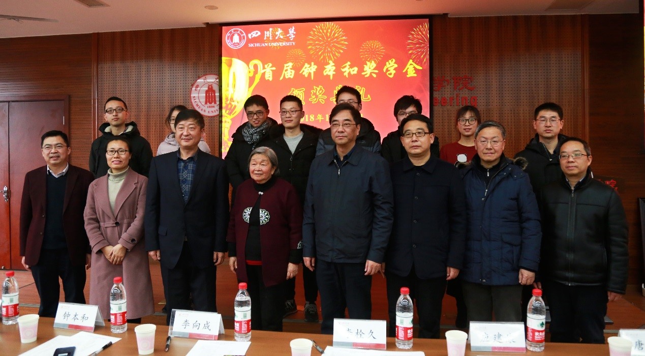 随后,研究生院副院长兼研究生工作部部长李栓久宣读了《关于表彰2018年四川大学“钟本和奖学金”获奖学生的决定》。在老师和同学们热烈的掌声中,校李向成副书记、李栓久部长、院庞国伟书记及钟本和教授为10位获奖学生颁发奖状并合影留念。