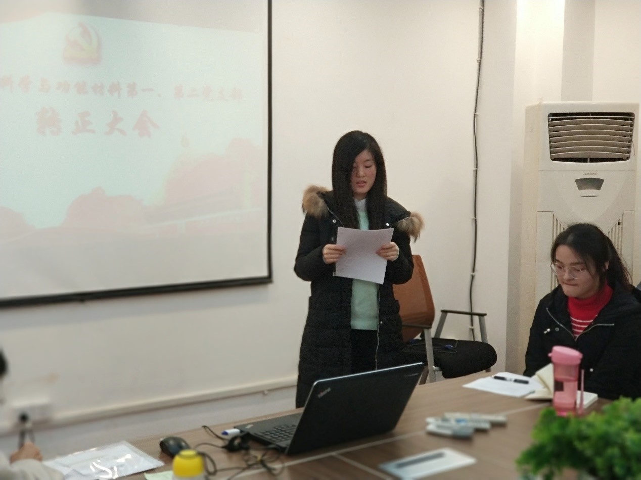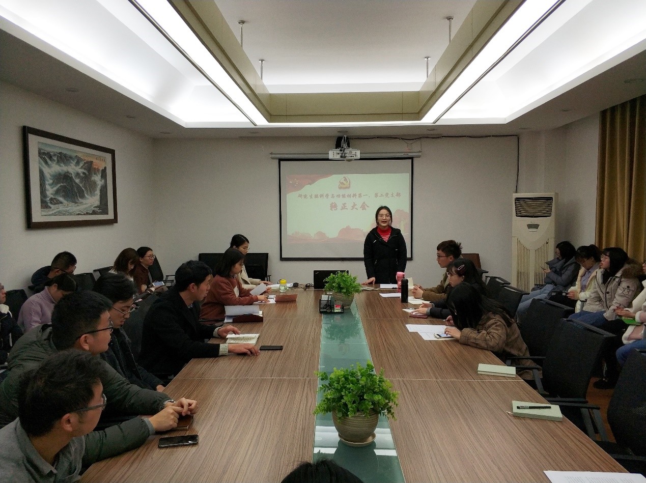 会议按照党员转正规程,先由转正对象苏瑶瑶和王泓岚同志向大家宣读了转正申请书,从转正申请中我们可以了解到,在预备党员的一年里面,两位同志在政治思想、学习、生活和工作等各方面严格要求自己,并且取得了巨大的进步:认真学习,专心科研,积极参加各项活动;同时,两位同志也表示在预备期间也发现了自身存在的一些不足之处,表明了改变的决心。随后,各发展对象的第一、二入党介绍人分别对其作出评价,说明其这一年预备期内思想、学习、工作以及生活上的优缺点,还有待改善和提高的地方,并表达了是否建议其转为正式党员的意见。在座的各位党员也对两位同志研究生入学以来的表现进行了评议,经过19名党员同志的无记名投票,与支部书记尹微虹同志宣读会议决议等环节,党支部全票通过了苏瑶瑶和王泓岚同志的转正申请。