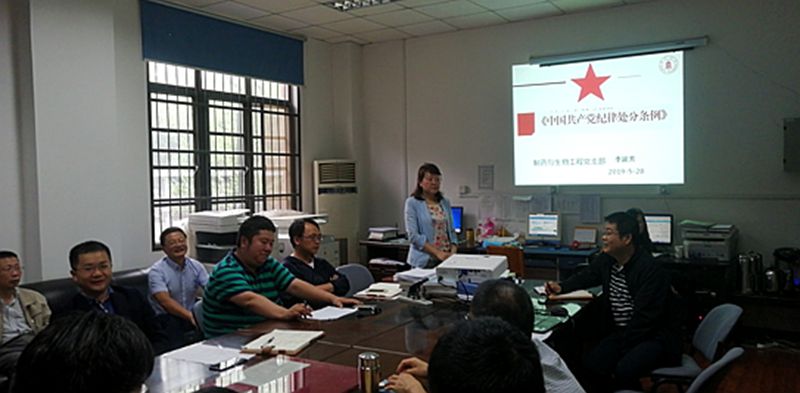 2019年5月28日下午,制药与生物工程系党支部于四川大学望江校区正行楼114会议室开展“明纪律,守底线”党风廉政学习活动。制药与生物工程系党支部全体党员参加此次学习,会议由支部书记李延芳主持。李延芳同志指出,新版《中国共产党纪律处分条例》从2018年10月起正式实施,相比于之前的15版,新版政治性更强,内容更科学,逻辑更严谨,指导性和操作性更强,需要每一位党员同志认真学习领悟其中的条例要求。